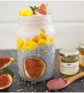 Fluffiger Protein Chia-Pudding mit pürierter Mango