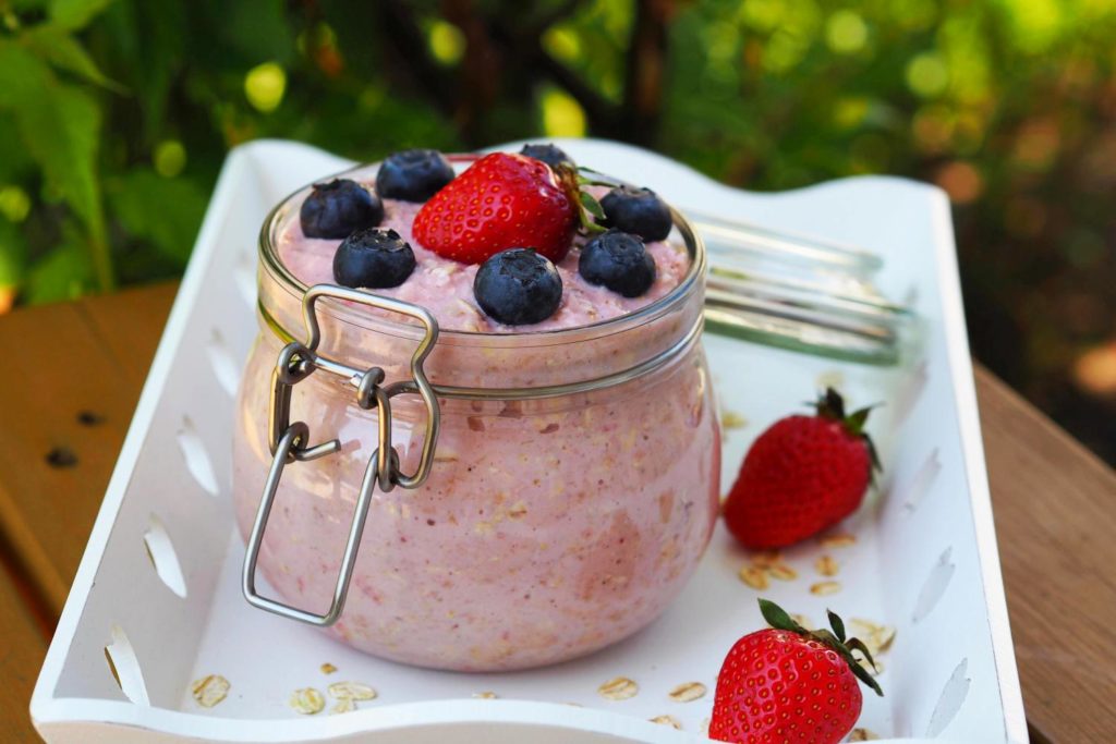 Wenn ich auswärts arbeite, dann finde ich Overnight Oats oder Bircher Müsli ganz toll. Diese kann man abends (auch gerne gleich für 2-3 Tage) vorbereiten, in Gläser umfüllen und einfach morgens schnell in die Tasche wandern lassen – total easy! Da kommst Du nicht auf komische Gedanken und kaufst dir irgendetwas ungesundes in der Arbeit oder unterwegs.