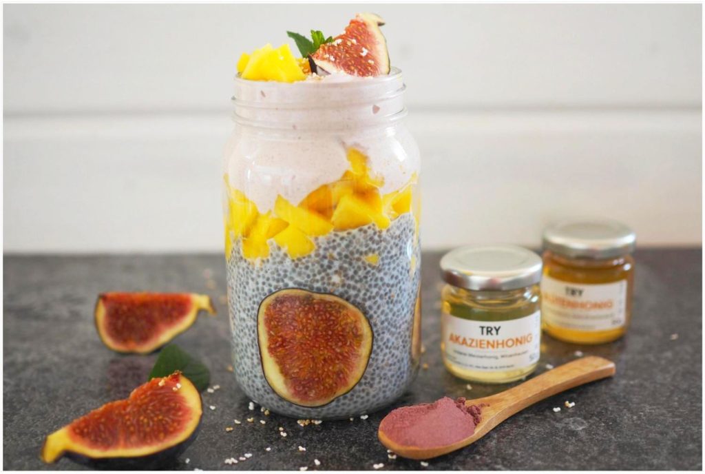 5. Chia-Pudding in ein Glas geben, darüber die gewürfelte Mango und am Schluß den Açai-Skyr.