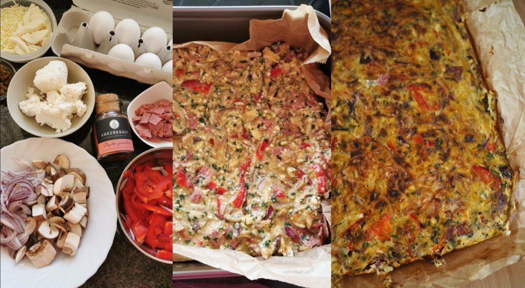 Ich hatte tatsächlich noch Zutaten von „richtiger Pizza“ übrig, die wir tags zuvor gemacht hatten – die einfach alle darin verwertet. Somit ging es noch schneller, weil alles schon geschnippelt war.