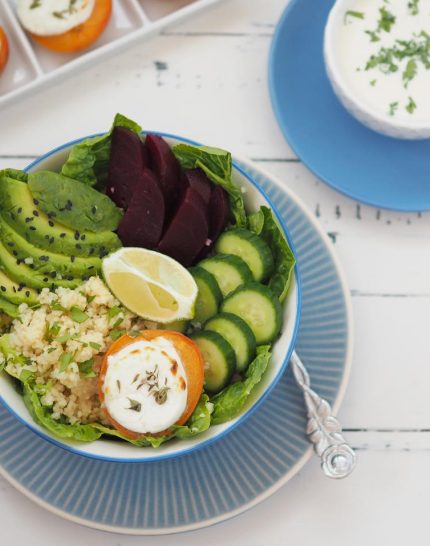 Couscous-Salat-Bowl mit Aprikosen und gratiniertem Ziegenkäse